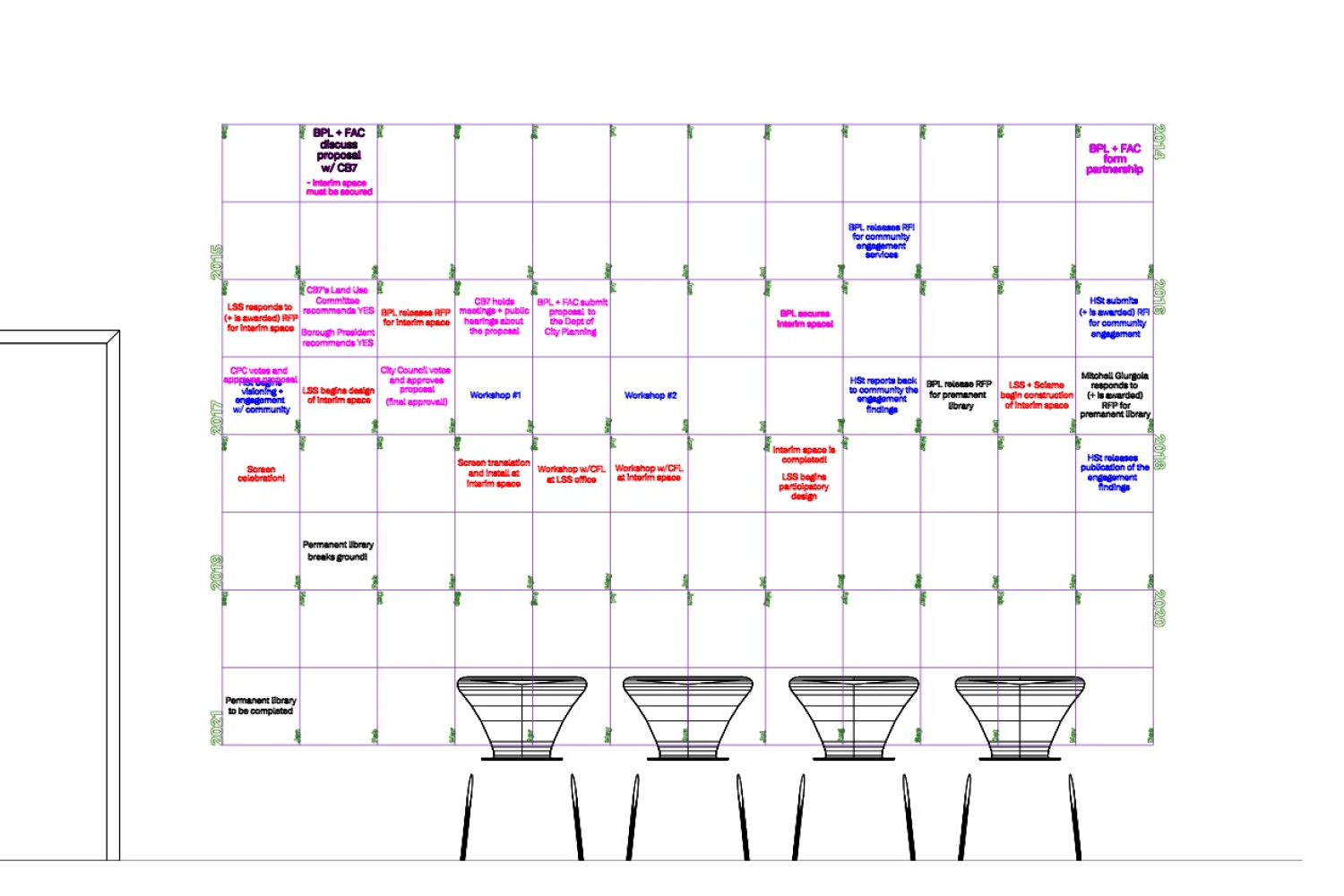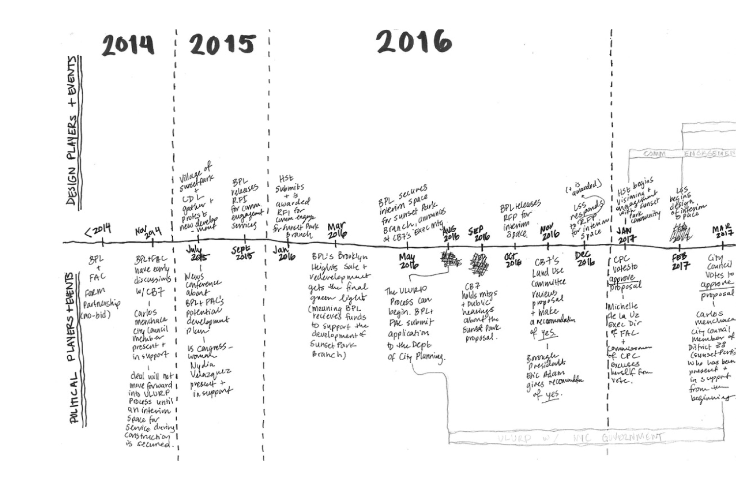 The timeline gives context to Brooklyn Public Library Sunset Park's brand new, soon to be finished building and the library that was built for the community in the interim. It serves as a road map and key to the exhibit and highlights collaborators who have contributed along the way.