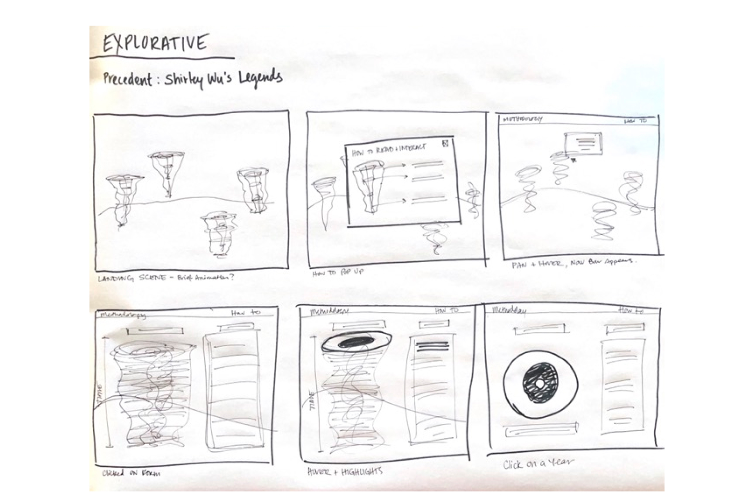Iterative sketching served to work through the 3D to 2D visualization concept. Three user experiences concepts were investigated: Semi-Guided (1), Fully Guided (2),and Explorative (3).